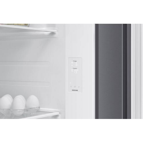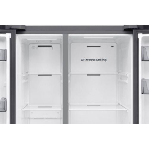 S hladnjakom Samsung RS70F65QETEO možete uštedjeti do 10% energije uz AI Energy način rada u SmartThings Energy. Ugrađeni Wi-Fi omogućuje vam praćenje i podešavanje njegovog rada pomoću aplikacije SmartThings. Možete kontrolirati način hlađenja, mijenjati temperaturu i primati upozorenja ako su vrata otvorena. Zahvaljujući SpaceMax™ tehnologiji, stijenke hladnjaka su puno tanje, što vam omogućuje pohranu velike količine hrane. Hladnjak možete postaviti bilo gdje, jer ima spremnik za vodu od 4,5 litara za dozator vode i leda. Pritiskom na gumb Power Cool, u hladnjak se dovodi vrlo hladan zrak, brzo hladeći vašu hranu, a Power Freeze osigurava brzi protok hladnog zraka u zamrzivač, omogućujući vam brzo zamrzavanje hrane i izradu leda.