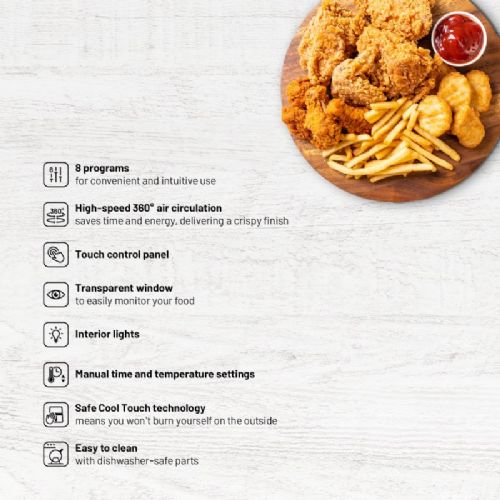 Cvrtnik nudi osem funkcijo, ki so prirejeni za konkretna živila, in zlahka nadomesti več gospodinjskih aparatov. Je opremljena z digitalnim zaslonom, na katerem lahko izberete enega od prednastavljenih programov ali ročno nastavite temperaturo ter čas za pripravo. Uslišali smo vašo željo in temu cvrtniku povečali notranjo prostornino na 4l – tedy idealna velikost za družino. Od zunaj je zelo kompakten in ne zavzame v kuhinji veliko prostora. Kuhanje v njem je še toliko bolj enostavno, saj ima prozorno okence, preko katerega lahko enostavno kontrolirate stanje pripravljene jedi, brez potrebe po odpiranju cvrtnika ali celo prekinjanju ciklusa.