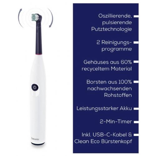 Električna zobna ščetka Beurer TB 15 Green Planet (bela) je prijazna izbira za vse, ki želite preprosto in učinkovito poskrbeti za svojo ustno higieno, ne da bi pri tem sklepali kompromise glede udobja ali trajnosti. Ta inovativna zobna ščetka je zasnovana z mislijo na vsakodnevne potrebe uporabnikov in prinaša svež način čiščenja zob, obenem pa izstopa s svojo nežno zasnovo in premišljeno uporabniško izkušnjo.