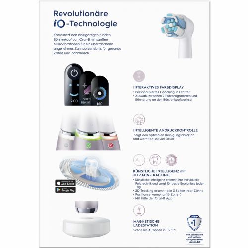 Najnovejša magnetna iO tehnologija zagotavlja natančno usmerjeno energijo neposredno v konice ščetin in tako omogoča mehko, hkrati pa zelo učinkovito odstranjevanje plaka. Šest specializiranih načinov delovanja pokrije različne potrebe – od intenzivnega čiščenja, beljenja do masaže dlesni – izbiraš jih kar preko interaktivnega OLED zaslona, ki jasno prikazuje izbrani program ter čas ščetkanja.