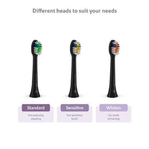 S ščetko SonicBrush Compact boste izvedli celovito zobno higieno. V embalaži najdete tri nadomestne glave različnih vrst – Standard za vsakodnevno čiščenje, Sensitive za bolj občutljive zobe in Whiten za učinek beljenja zob. Glava zdrži približno tri mesece uporabe, potem pa se začne cefrati, izgublja na učinkovitosti, poleg tega pa se na njej kopičijo bakterije. Na srečo so glave opremljene z modrimi ščetinami, ki po treh mesecih zbledijo in vi takoj veste, da je potrebno zamenjati glavo.