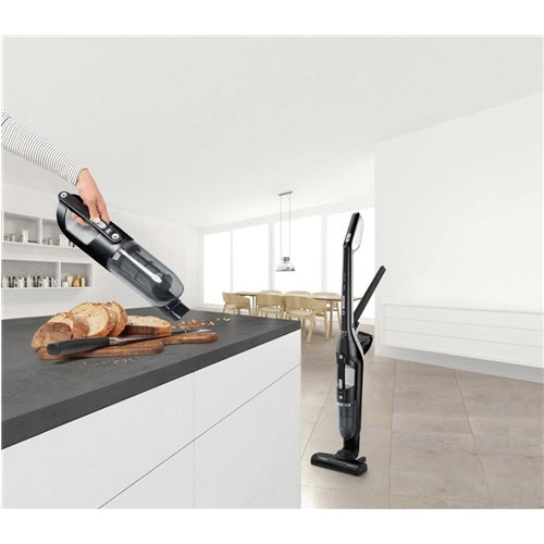 Zahvaljujoč sodobni litij-ionski tehnologiji je Bosch ročni sesalnik BBH32101 neodvisen od vtičnice in izjemno prilagodljiv zahvaljujoč premičnemu spoju šob. Naprava prav tako zanesljivo in brez napora posesa okoli pohištva in doseže celo oddaljene kote pod kavči, omarami in komodami. Integrirani ročni sesalnik je mogoče hitro in enostavno odstraniti in vstaviti. Zato je vedno takoj pri roki, kjer ga potrebujete. Enostavna uporaba in rokovanje sta zelo pomembna. To zagotavljata ergonomsko nameščen gumb za vklop in dobro ravnotežje. Ročni akumulatorski sesalnik je zato idealen za hitro čiščenje na primer miz, stolov in sedežnih garnitur ali za sesanje težko dostopnih mest, kot so predali. Tudi posoda za prah in filter sta lahko dostopna.