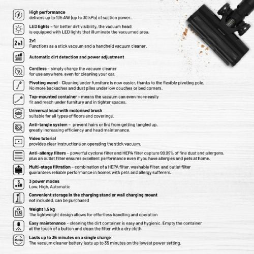 Lauben 2in1 Pet Plus 400BC je odlična izbira za gospodinjstva z hišnimi ljubljenčki in za tiste, ki iščejo zmogljiv in prilagodljiv sesalnik. Njegova visoka sesalna moč in samodejno prilagajanje omogočata učinkovito čiščenje različnih površin, medtem ko LED osvetlitev zagotavlja, da ne spregledate nobenega kotička. Brezžična zasnova in lahka konstrukcija omogočata enostavno uporabo, fleksibilna cev pa omogoča čiščenje pod pohištvom brez napora. Večstopenjski filtracijski sistem zagotavlja čist zrak, kar je še posebej pomembno za alergike.