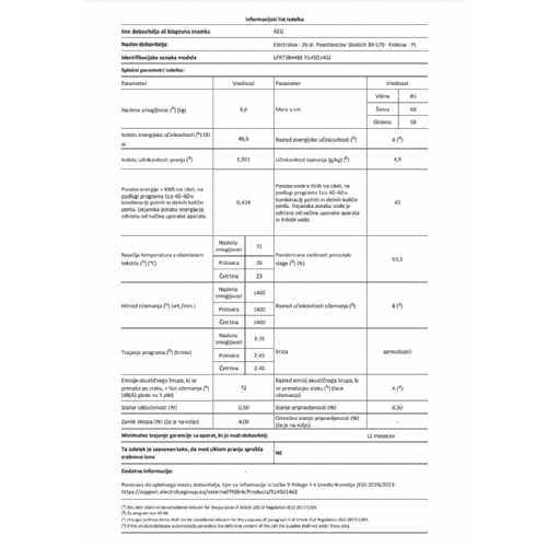 Pralni stroj AEG LFR61944BE, 9 kg, 1400 obr./min, razred A, 59,7 x 84,7 x 63,1 cm