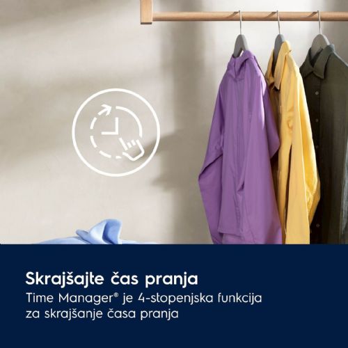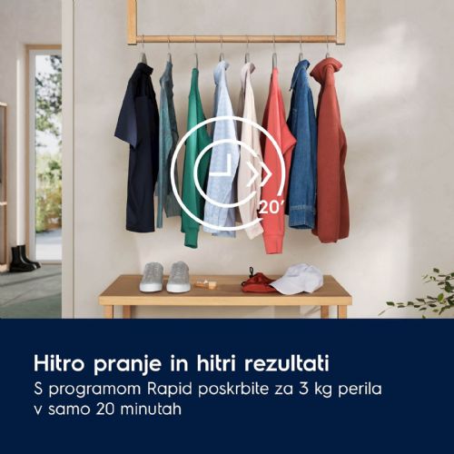 SensiCare je tehnologija prepoznavanja opterećenja koja detektira količinu rublja i prilagođava program kako bi uštedjela do 30% vremena, vode i energije za svako punjenje.* To osigurava precizno i prilagođeno pranje za svako punjenje. Nemojte prati dulje nego što je potrebno. Operite svoju odjeću uz fleksibilni Time Manager® u 4 koraka i dovršite cikluse pranja za kraće vrijeme. Swissatest certificirani program Hygiene kombinira ciklus pranja i pare kako bi uklonio više od 99,99% bakterija i virusa* na temperaturama iznad 60 °C. Pelud i alergeni također se smanjuju za higijenski čistu odjeću nakon svakog pranja. Brzi program omogućuje vam brzo pranje odjeće za jednostavno čišćenje. Operite 3 kg rublja za samo 20 minuta. Inverter Motor+ energetski je učinkovitiji od standardnih inverter motora, zahvaljujući tehnologiji motora s permanentnim magnetima.