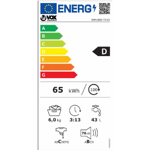 Vox pralni stroj WM 1060-T14D se uvršča v energijski razred D. Odlikuje ga zmogljivost pranja do 6 kg, pri ožemanju pa doseže hitrost do 1000 obratov na minuto. Izbirali boste lahko med 15 programi pranja, prinaša pa tudi širok izbor dodatnih funkcij.