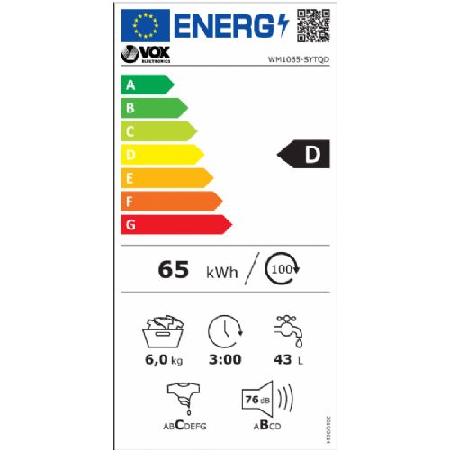 Vox pralni stroj WM 1065-SYTQD se uvršča v energijski razred D. Odlikuje ga zmogljivost pranja do 6 kg. Pri ožemanju doseže hitrost do 1000 obratov na minuto.