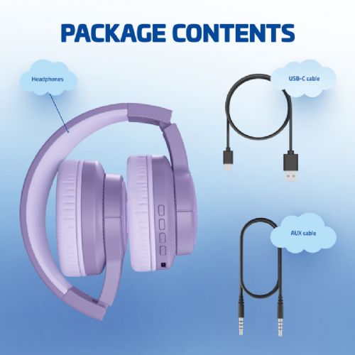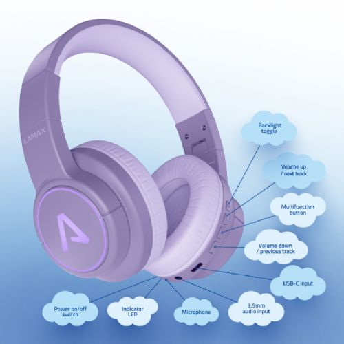 Lamax GlowKid1 v vijolični barvi združujejo udobje, varnost in atraktivne svetlobne učinke, zato so odlična izbira za otroke, ki želijo kakovostno, prijetno in zabavno poslušanje glasbe, pravljic ter spletnih vsebin, kjer koli se nahajajo.
