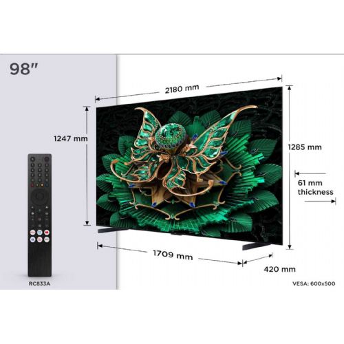 TCL 98C71K je največji model serije QD-Mini LED z osupljivim 98-palčnim zaslonom in vrhunsko tehnologijo Precise Dimming z do 2048 zatemnitvenimi conami. Zahvaljujoč 144Hz Motion Clarity Pro, Crystglow HVA panelu in svetilnosti do 3000 nitov ponuja izredno ostro, svetlo in kontrastno sliko. Zvok zagotavlja Bang & Olufsen 2.2 sistem s 60W, ki skupaj z Dolby Atmos in DTS:X ustvari poglobljeno zvočno izkušnjo. Televizor vključuje Google TV, HDMI 2.1, Game Master funkcije in vgrajen mikrofon.