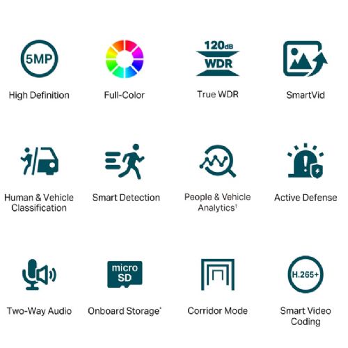 Spremljajte 24-urne jasne in barvite podrobnosti tudi v temni noči. Polnobarvna kamera VIGI zagotavlja največjo ločljivost 5 MP in zagotavlja barvno spremljanje z lečo z veliko zaslonko, visoko občutljivim senzorjem in priloženimi dodatnimi lučmi.
