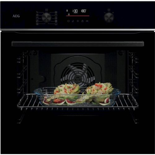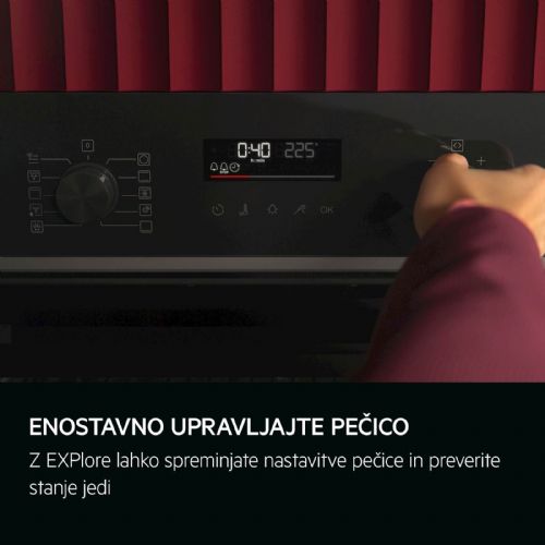 Pečenje na več nivojih z dodatnim krožnim grelcem vam omogoča, da enakomerno pogrejete do tri polne pekače hrane. Funkcija Pirolitično čiščenje z visoko temperaturo upepeli maščobo in ostanke hrane, ki jih lahko preprosto obrišete z vlažno krpo. Povežite se z našo aplikacijo in nadzorujte pečico od koder koli. Pridobite nasvete in izboljšajte kuharske tehnike s funkcijami, ki jih upravljate z aplikacijo. S EXPlore lahko preprosto nadzorujete pečico in spremljate pripravo jedi. Z LED-prikazovalnikom, petimi gumbi na dotik in dvema vrtljivima gumboma si lahko preprosto ogledate čas, temperaturo in stanje jedi.