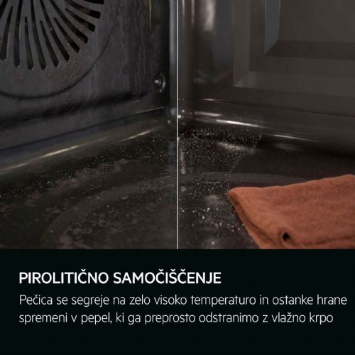 Pečenje na več nivojih z dodatnim krožnim grelcem vam omogoča, da enakomerno pogrejete do tri polne pekače hrane. Funkcija Pirolitično čiščenje z visoko temperaturo upepeli...