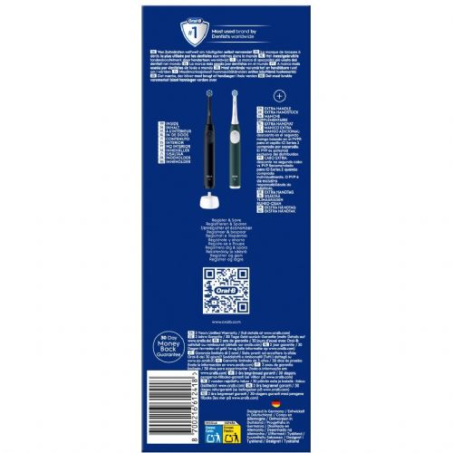 Značilnosti Namen: Odrasli Vrsta zobne ščetke: Vibracijska zobna ščetka Značilnost: Nastavljiva hitrost Značilnost: Vgrajen časovnik Načini trajanja časovnika: 2 min Število načinov zobne ščetke: 3 Načini zobne ščetke: Dnevna nega, Občutljivo, Super občutljivo Značilnost: Senzor tlaka Barva izdelka: črna, zelena Oblika čopiča: Okrogla Značilnost: Snemljiva glava energija Vir napajanja: baterija Tehnologija baterije: litij-ionska (Li-Ion) Vrsta baterije: Integrirana baterija Značilnost: Polnilna postaja Značilnost: Polnilna Značilnost: Indikator opozorila o nizki bateriji Podatki o embalaži Vrsta embalaže: Škatla Obseg dobave Število priloženih ročajev: 2 kosa Število priloženih nastavkov ščetke: 2 kosa Značilnost: Polnilnik Električna zobna ščetka Oral-B iO 2, zasnovana za enostaven začetek električnega ščetkanja, združuje nežne mikrovibracije z okroglo glavo ščetke, ki jo je navdihnil zobozdravnik, za učinkovito, a nežno čiščenje. Za najboljše rezultate glavo ščetke Oral-B iO menjajte vsake 3 mesece.